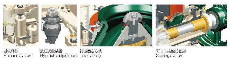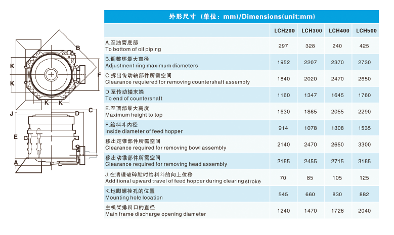 LCH series cone crushers can be converted from the finest to the coarsest simply by replacing the mantle, bowl liner, adapter ring and the wedge bolts.