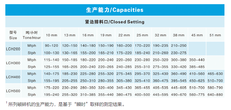 Cone crusher capacity charts are developed for use as an application tool to properly utilize the LCH crusher’s capabilities. The capacity figures shown apply to material weighing 1600kg per cubic meter. The crusher is one component of the circuit. As such, its performance is in part dependent on the proper